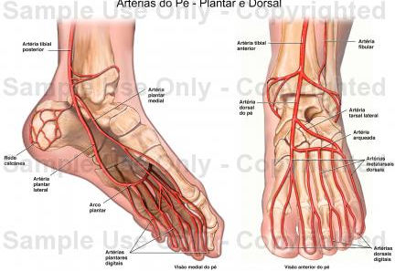 As artérias presentes no pé são ramos terminais das artérias tibiais anterior e posterior que correspondem respectivamente as artérias dorsal e plantares.